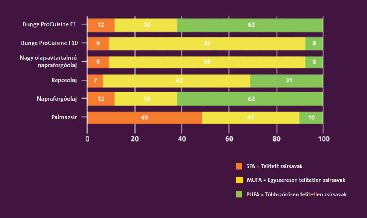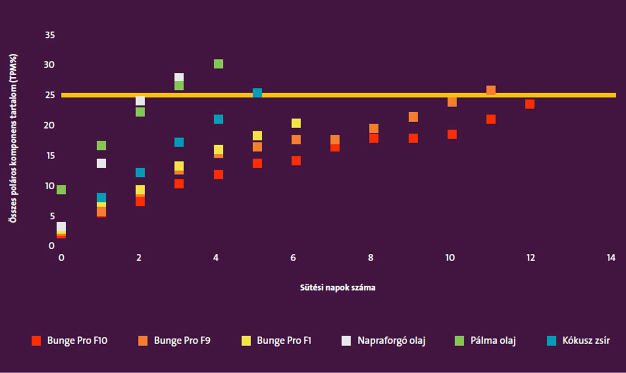 A grafikonon a napi hat órában végzett sütési teszt során vegyesen sültkrumpli és panírozott hústerméket készítve az alap olajok 2-4 napig (azaz 12-24 óráig) míg a Bunge Pro termékek 5-12 napig (F1 – 30 óra; F9 – 60 óra; F10 72 óra) alkalmasak sütésre mielőtt cserélni kell.