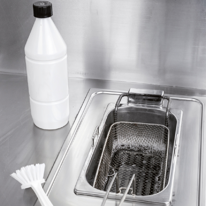 - Forraljuk ki az olajsütőt, a kosarakat és a leszedőket jó minőségű, kereskedelemben kapható olajsütő-tisztítószerrel, követve a gyártótól származó használati utasítást (a szokásos ajánlás alapesetben 30 perces kifőzés). Ezzel egyidejűleg tisztítsuk ki a fémkosarakat úgy, hogy beáztatjuk őket az oldatba – így fellazul rajtuk a sütés közben polimerizálódott anyag. Kapcsoljuk ki a hőt, és az összes fellazult lerakódást távolítsuk el nejlon súrolószivaccsal! Ne használjunk fémszivacsot vagy drótkefét, ezek ugyanis felkarcolják a felületet, és fémforgácsokat hagyhatnak az olajsütőben! A polimerizálódott anyagot maradéktalanul el kell távolítani!